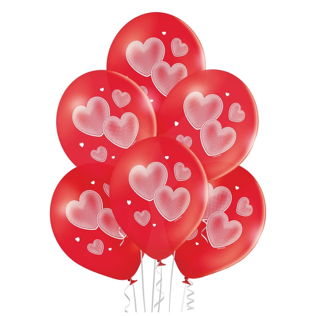 12/ vel. 12", červené balónky s motivem srdíček v sadě 6 ks, potisk 1 strana
