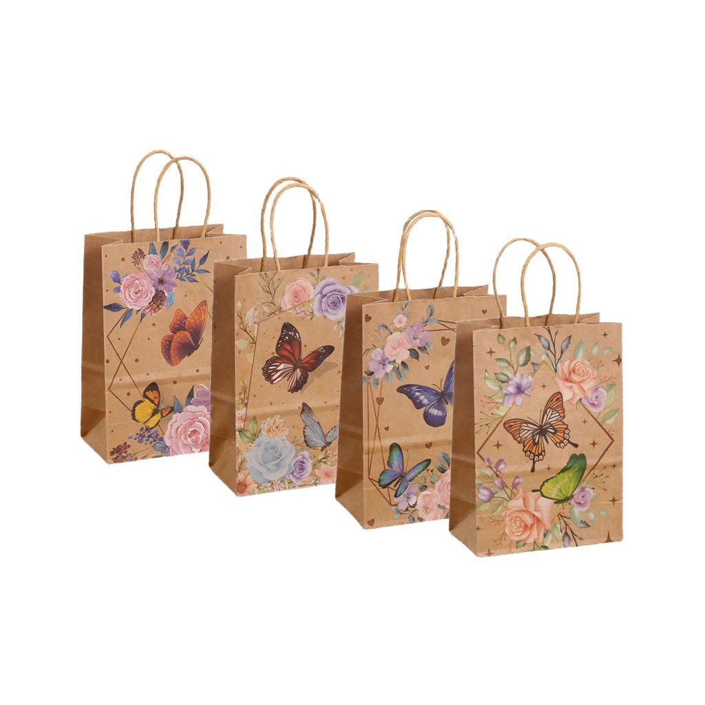 12/ papírová dárková taška s potiskem motýlů a květin, je vyrobená z hnědého kraftového papíru, kroucená papírová ouška, rozměr 15 x 21 x 8 cm, mix 4 motivů