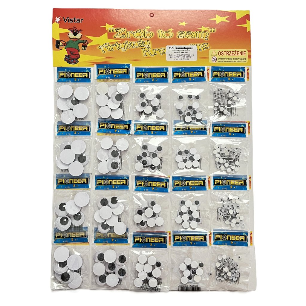 20 sáčků na blistru, 5 velikostí samolepicích očí (cca 40 ks - pr. 0,5 cm, 12 ks - pr. 0,8 cm, 10 ks - pr. 1 cm, 8 ks - pr. 1,5 cm a 6 ks - pr. 1,8 cm), cena za blistr