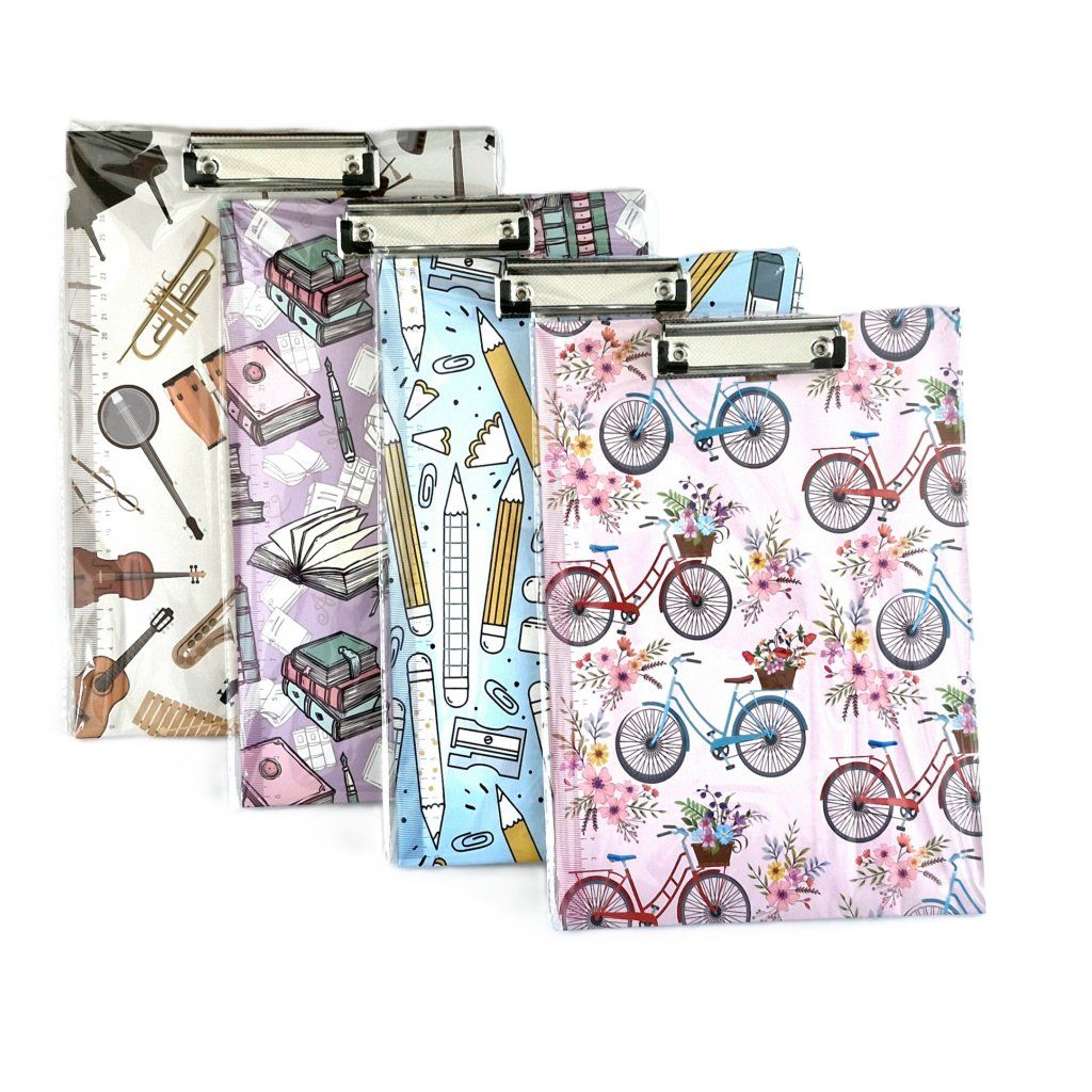 pevná kartonová deska s motivem hudebních nástrojů, bicyklů, psacích potřeb a knih, s měřítkem, kovový klip, tl. desky 3 mm, mix 4 barev/motivů