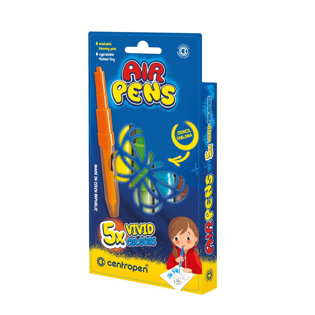 foukací fixy na papír, zdravotně nezávadný inkoust, snadno smyvatelné a vypratelné, 5 barev pastelových odstínů, 1 šablona