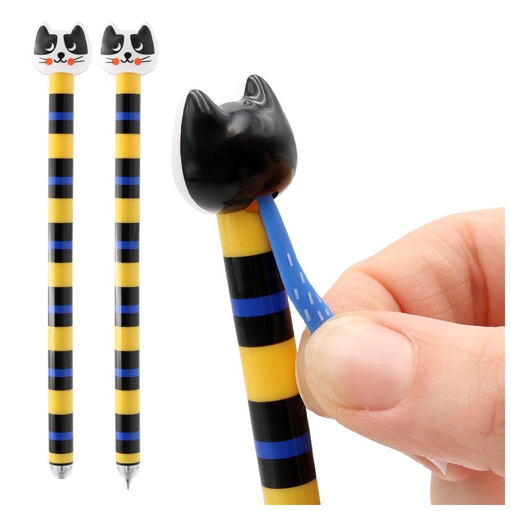 36/ hladké plastové tělo s potiskem a s hlavou kočičky, potažením gumového ocásku se vysune/zasune tuha, guma je umístěná na špičce pera, hrot 0,7 mm, vyměnitelná náplň Colorino, mix 4 barev/druhů