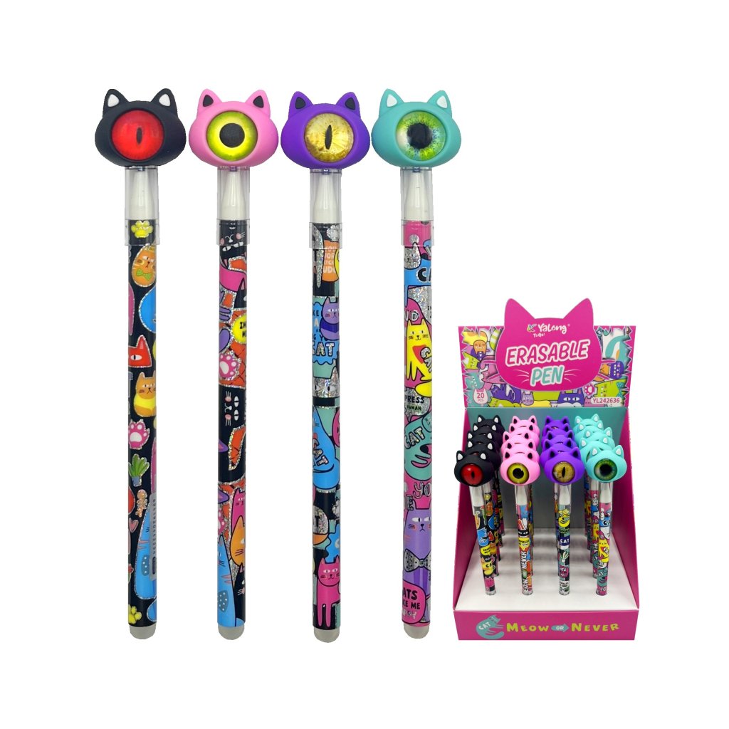 20/ hrot 0,5mm, hladké, kulaté tělo pera s lesklým potiskem koček a 3D dekorací, pryžová hlava kočky s okem na vršku pera, vyměnitelná náplň, mix 4 barev/motivů