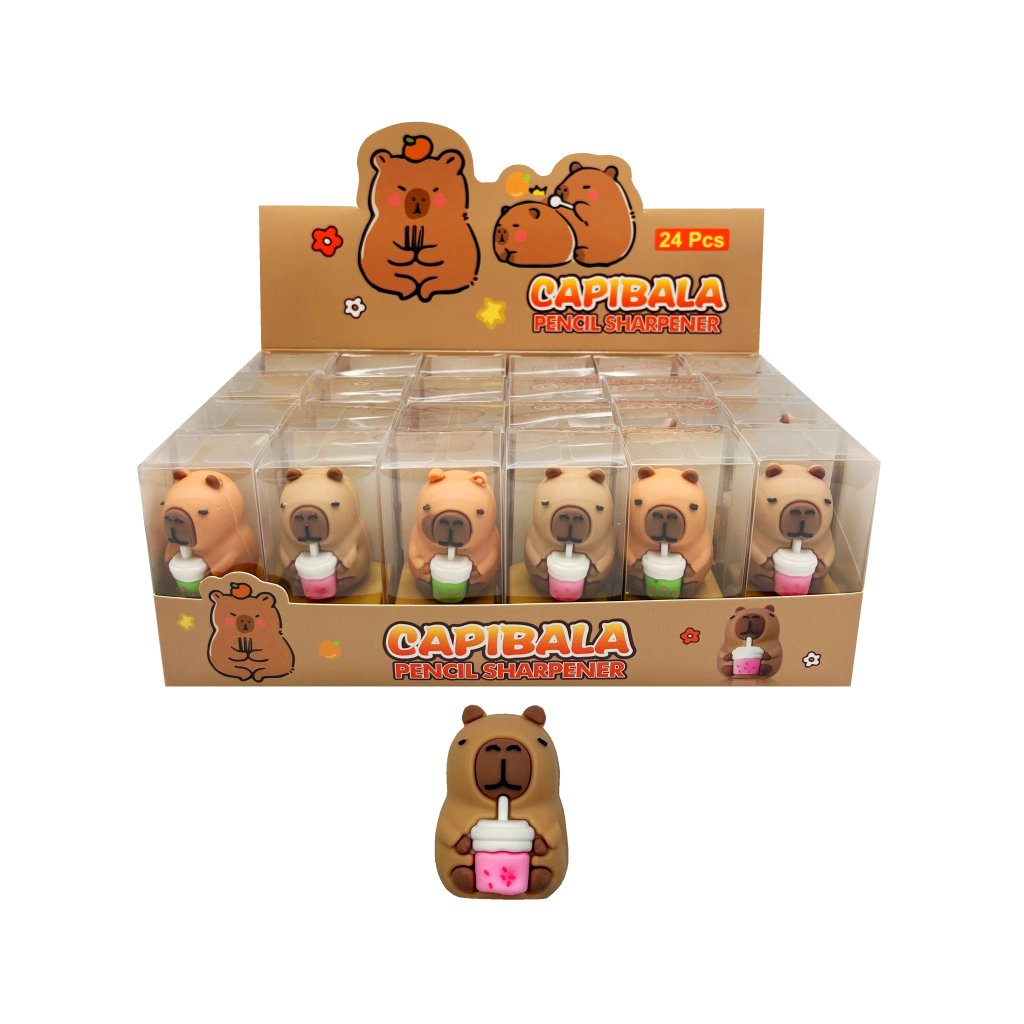 24/ gumová postavička capybary slouží ke gumování + plastové jednoduché ořezávátko, rozměr 4 x 3 cm, balené v plastové krabičce se závěsem