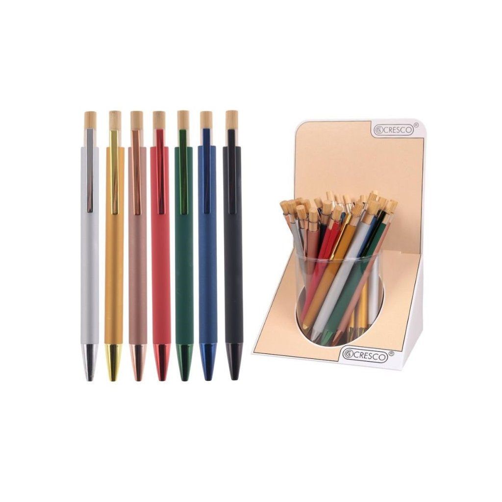 36/ kovová propiska s tělem v matné barvě a lesklými chromovanými doplňky stejné barvy, soft povrch, vrchní části dominuje dřevěné tlačítko, vyměnitelná velkoobsahová náplň, mix 7 barev
