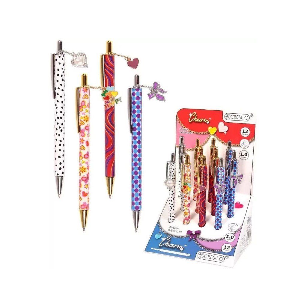 12/ kovová propiska s barevným potiskem a kovovým přívěskem, lesklé chromované doplňky ve stříbrné/zlaté barvě, vyměnitelná velkoobsahová náplň, mix barev/vzorů