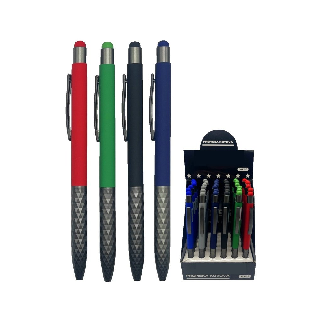 36/ kovová propiska s gumou pro ovládání dotykových displejů v barvě propisky, soft povrch, černé doplňky, vyměnitelná náplň délky 11cm, mix barev