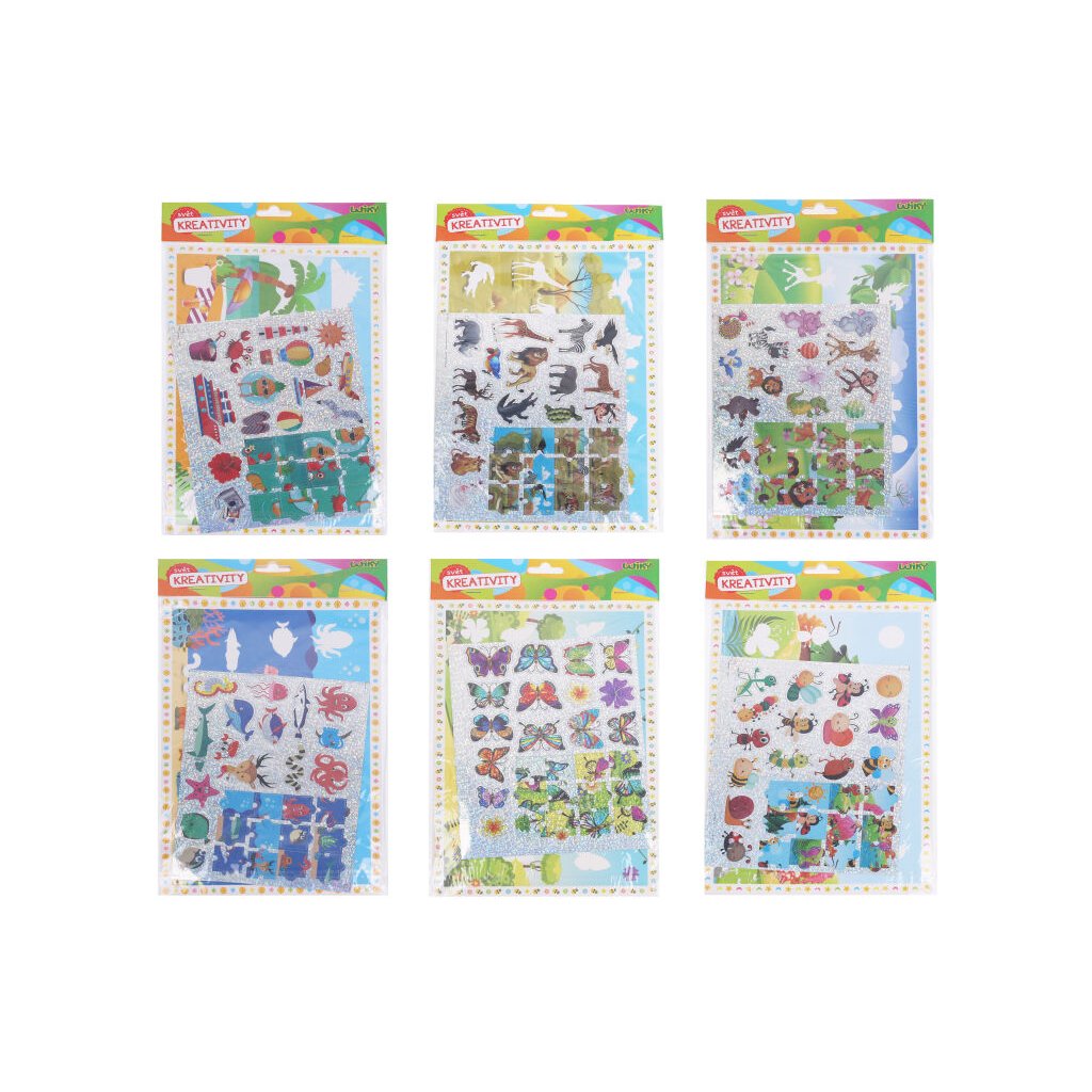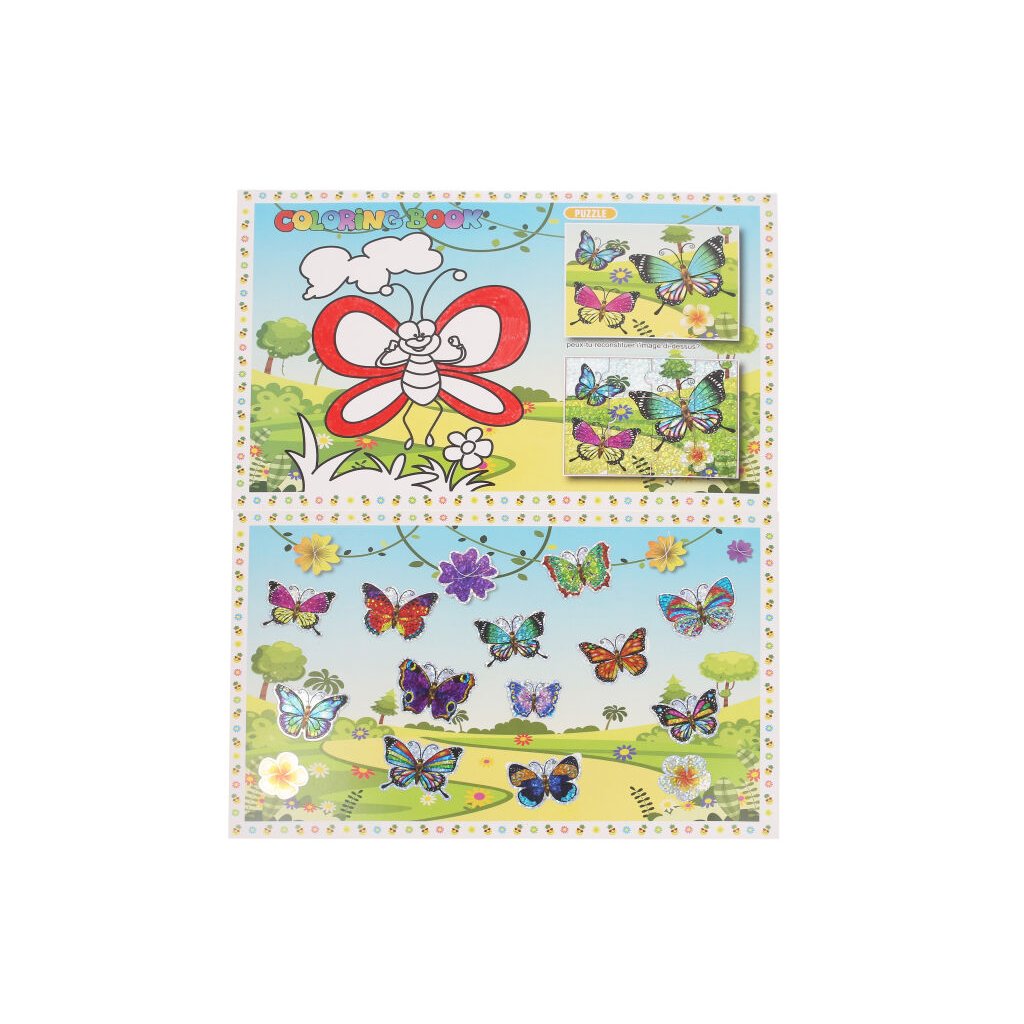 Jedna strana obsahuje předtištěný obrázek, na který se doplňují samolepky, druhá strana obsahuje předtištěný obrázek určený k vymalování a malé puzzle, na které se doplňují samolepky.