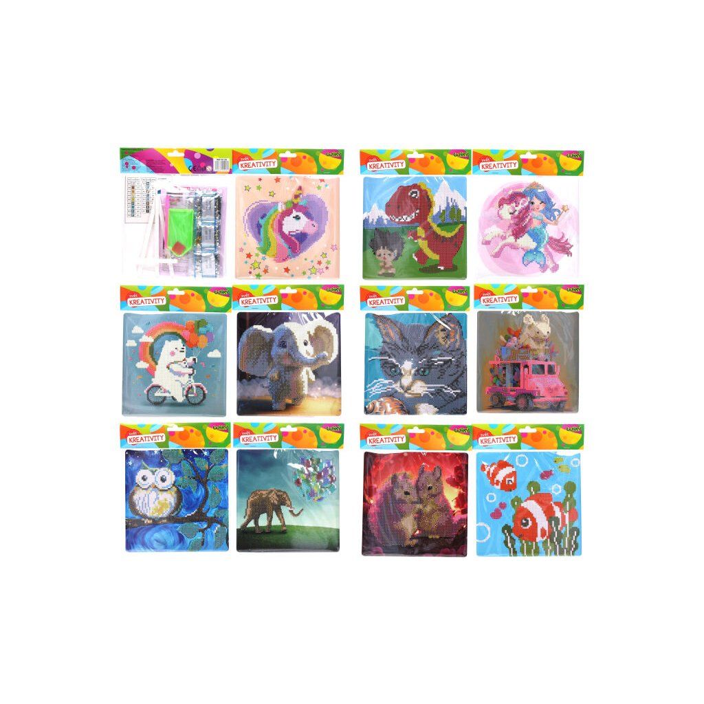 10/ set obsahuje předtištěný obrázek o rozměru 20 x 20 cm, pryskyřičný diamant, plastové pero, malý podnos, vosk, plastový stojánek na výsledný obrázek a návod, mix 12 motivů