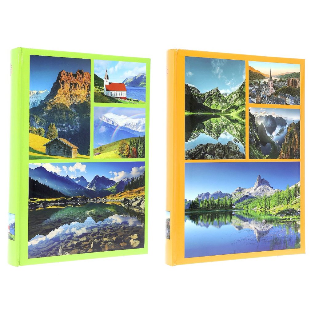 12/ pro fotky o rozměru 10 x 15 cm, šitá vazba, s popisky, 3 fotky nad sebou, mix 2 barev/motivů