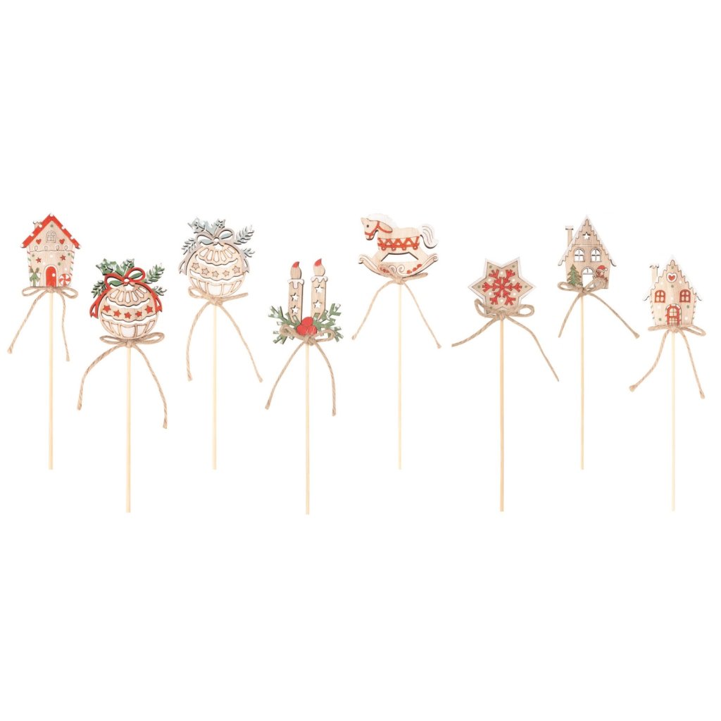 sada 24 ks dřevěných zápichů v ohrádce, mix 8 motivů (hvězda, baňka, svícen, chaloupka a houpací koník), dřevěné