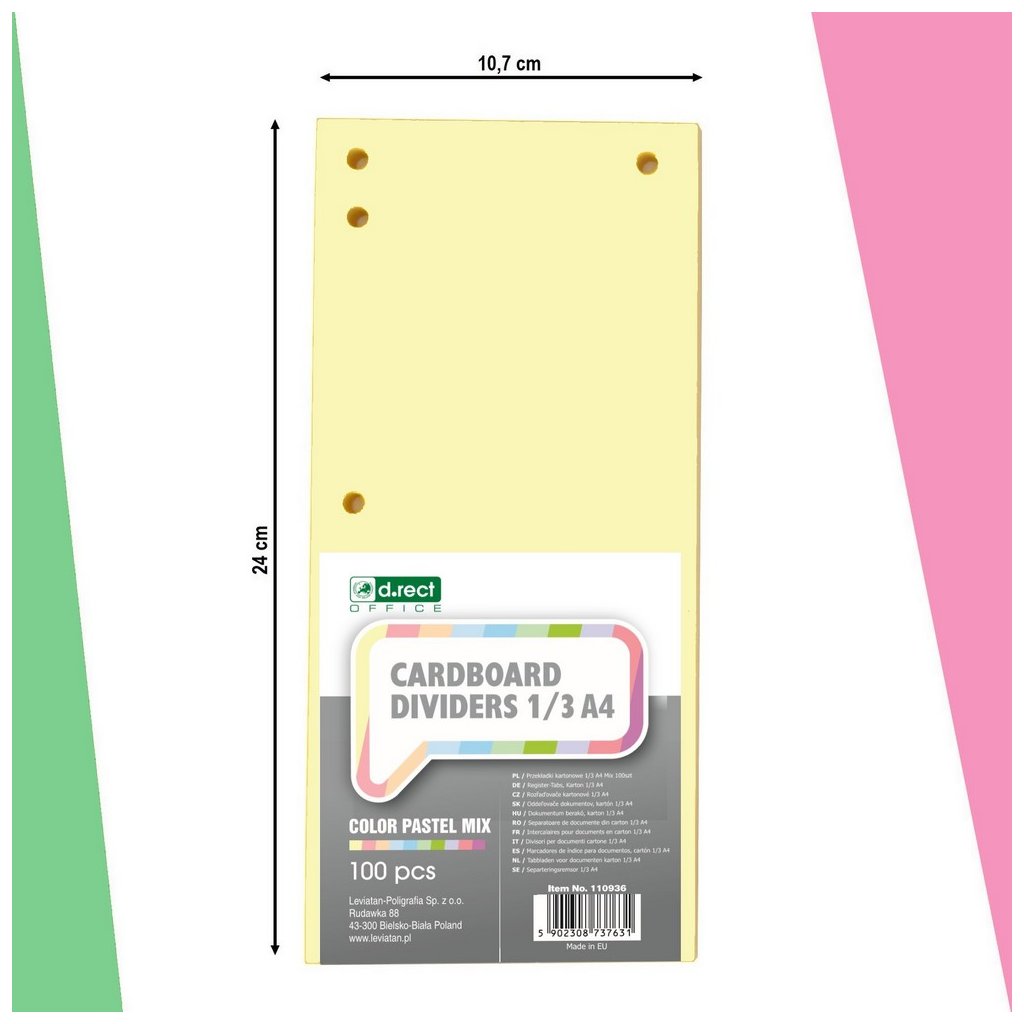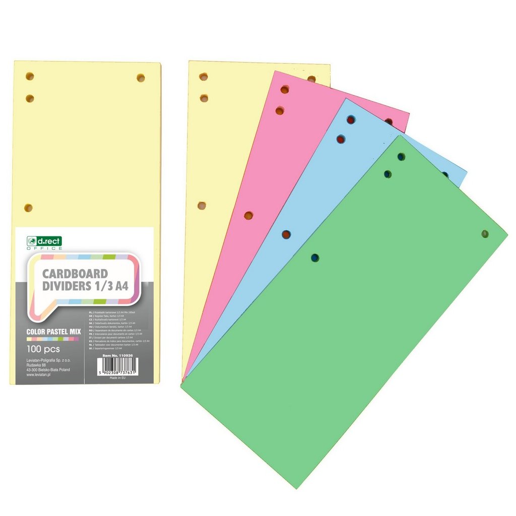 formát 1/3 A4, barevné pásky z pevného kartonu určené do pákových pořadačů, vyrobené z ekologického kartonu 200g/m2, perforace na obou okrajích umožňuje vertikální i horizontální upevnění rozdružovače do pořadače, určené ke třídění dokumentů A4, 5 pastelových barev v balení