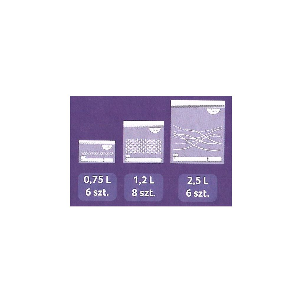 dvojitý zip, multifunkční, objem 0,75 litrů - 6 ks, 1,2 litrů - 8 ks a 2,5 litrů - 6 ks, 20 sáčků v krabičce, cena za krabičku
