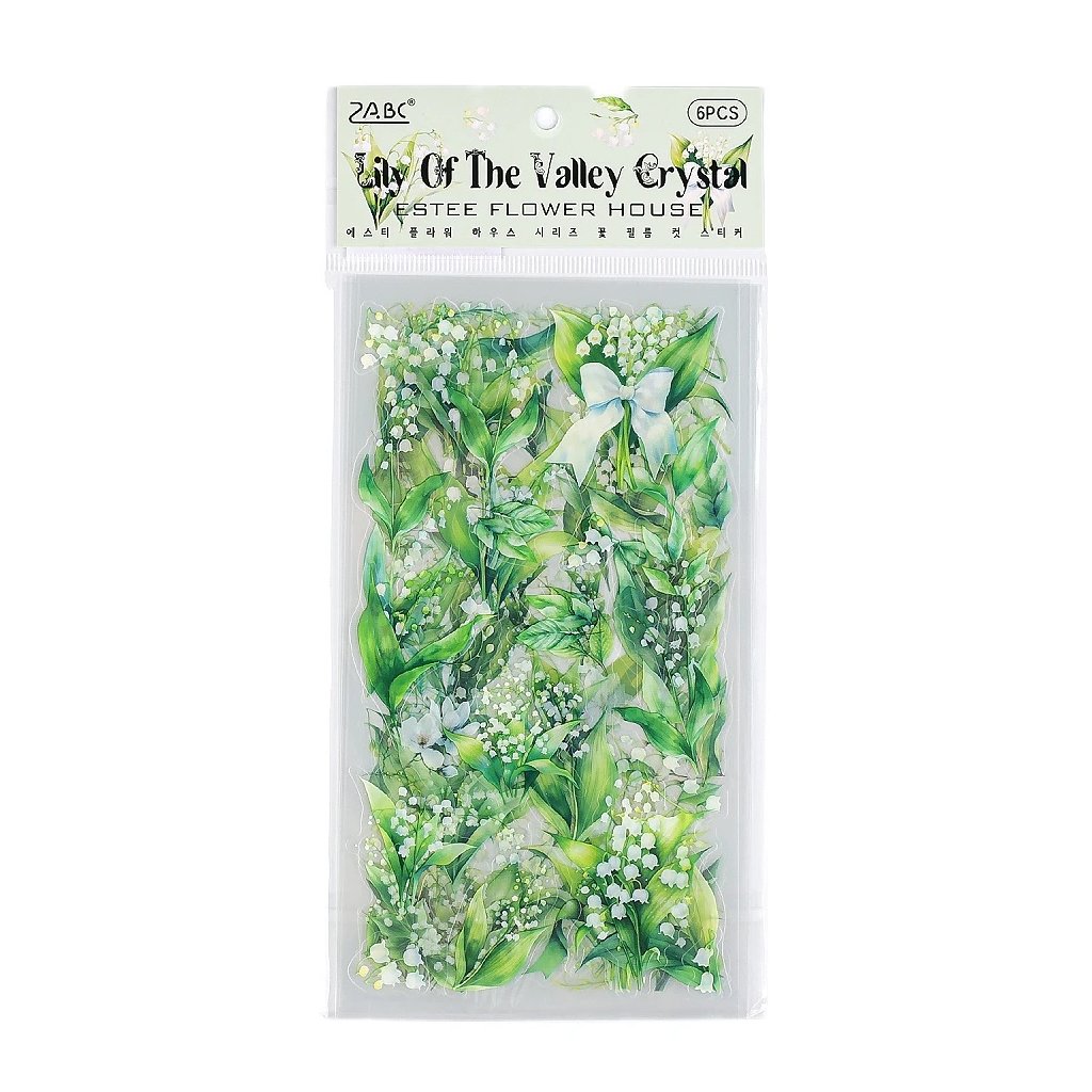 Samolepky z kvalitní průhledné PET fólie s motivem konvalinek a průhledným pozadím.