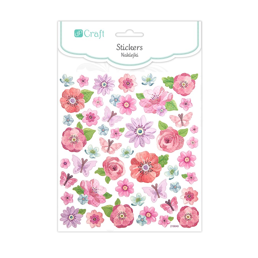 Papírové samolepky s motivem barevných květů a motýlů s duhovými třpytkami.