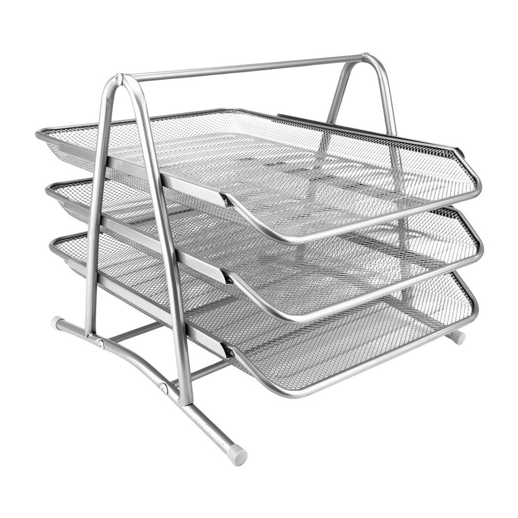 drátěný, 3 výsuvné police pro snadné prohlížení dokumentů, na podstavci jsou speciální gumové ochrany, které zabraňují poškrábání stolu, zásuvky jsou vyrobeny z kovové sítě pokryté stříbrným lakem, rozměry 350 x 297 x 275 mm