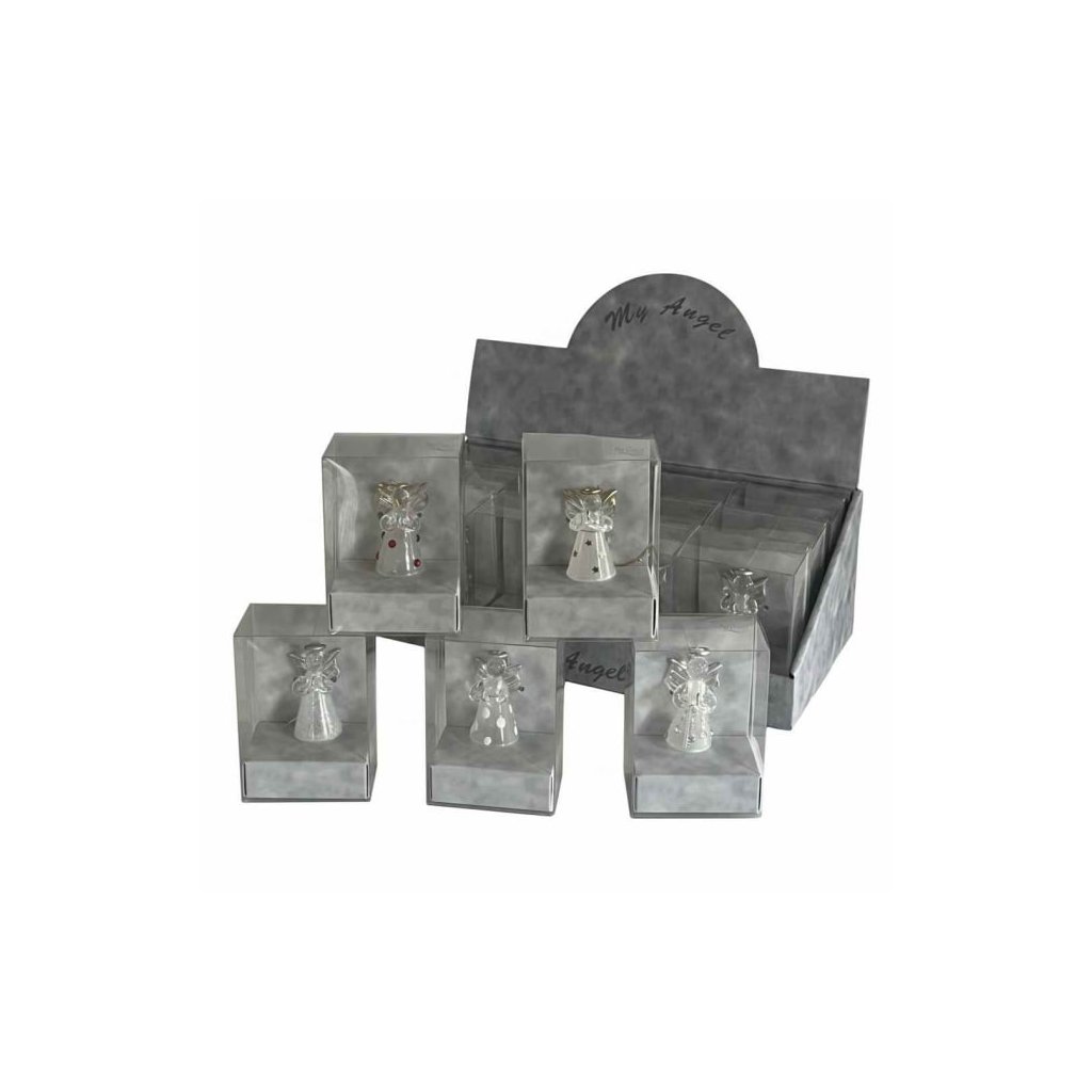ručně vyráběný skleněný anděl na zavěšení, výška anděla 4,5 cm, baleno v průhledné krabičce, mix 6 barev, v sadě 12 ks v mixu, cena kus