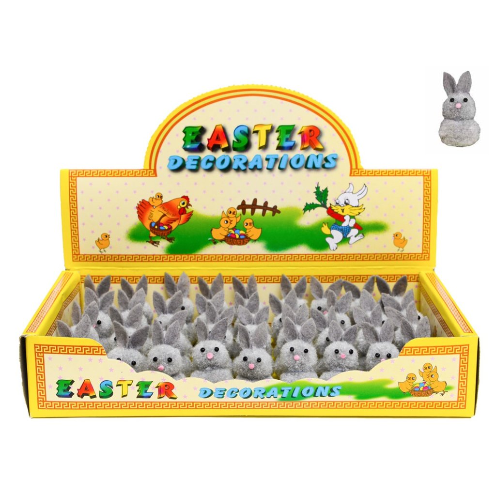 šedý plyšový zajíček na plastovém stojánku, 36 ks v papírové krabičce, cena za sadu