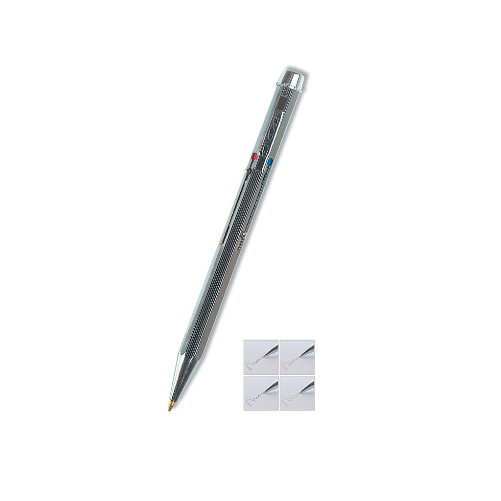 12/ Tradiční čtyřbarevné kovové pero stříbrné barvy, náplň Mini (RD1) - modrá, červená, černá, zelená náplň