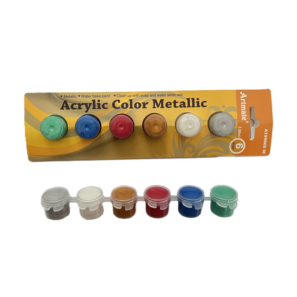 12/ sada 6 metalických barev v kelímku s objemem 3,68 ml, vysoce kvalitní akrylové barvy, plné barevných sytých pigmentů, vhodné pro malování a dekorování nejrůznějších povrchů – kamenů, keramiky, skla, modelů letadel, dřeva a dalších materiálů